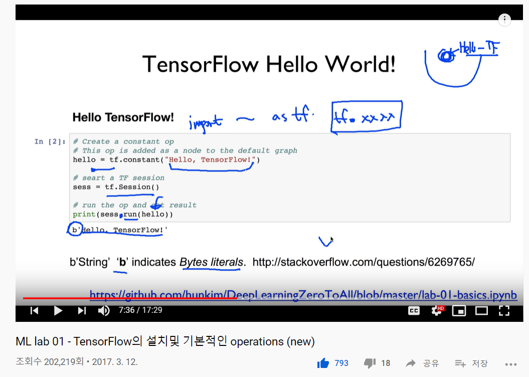저는 요즘 유튜브에서 김성훈 교수님의 '모두를 위한 딥러닝 강좌 시즌1' 를 들으며 텐서플로우를 이용한 딥러닝을 복습해보고 있어요. 그런데 시작부터 부닥치는 문제점이 참 많아요. 그중에 하나가 바로 TensorFlow의 Session 모듈!