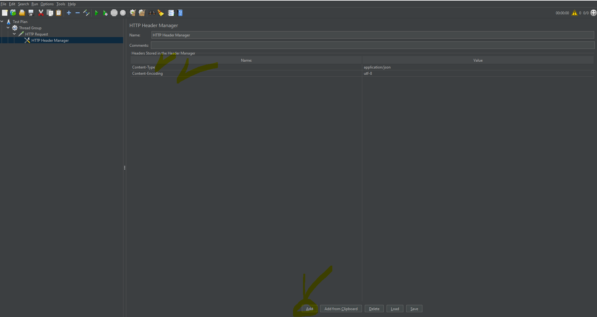 아래 이미지와 같이 Content-Type, Content-Encoding 등 HTTP 요청 헤더 정보를 입력하세요. (아래 부분에 Add 버튼이 있습니다.)