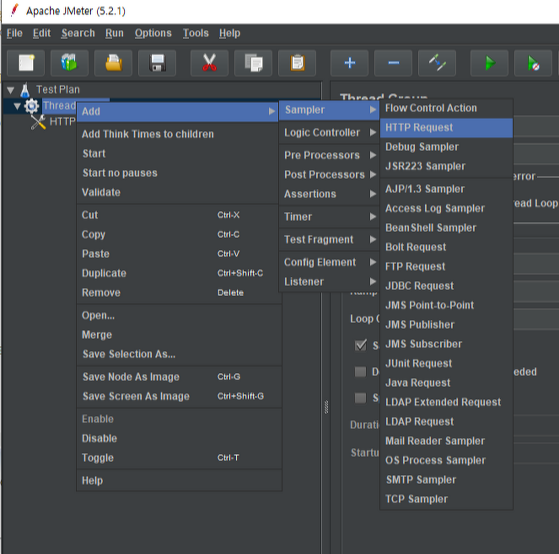 Thread Group 우클릭 > Add > Sampler > HTTP Request