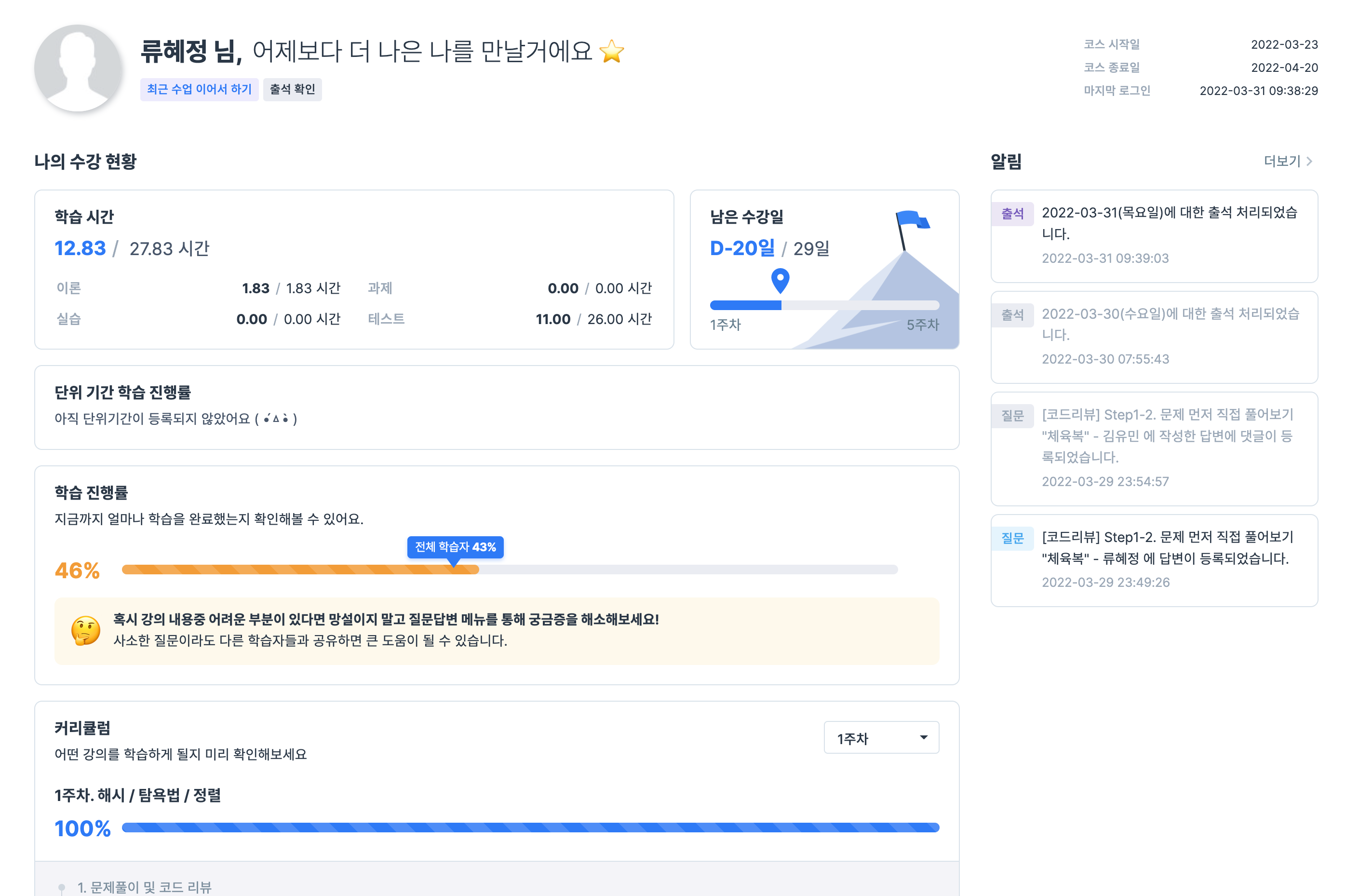 그래서 프로그래머스에서 운영하는 알고리즘 파이썬 스터디를 신청해 진행하고 있다. 코딩 테스트 준비 코스이긴 한데 코테에 응시하려는 목적은 아니고, 커리큘럼이 짧고 효율적으로 짜여있는 것 같아서 골랐다.